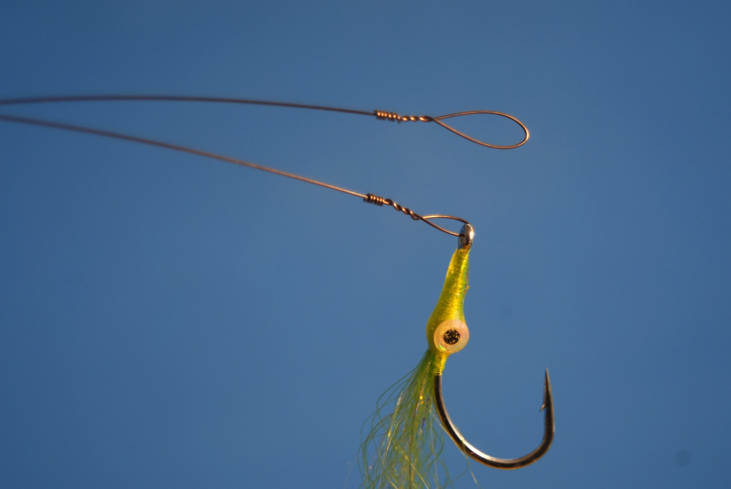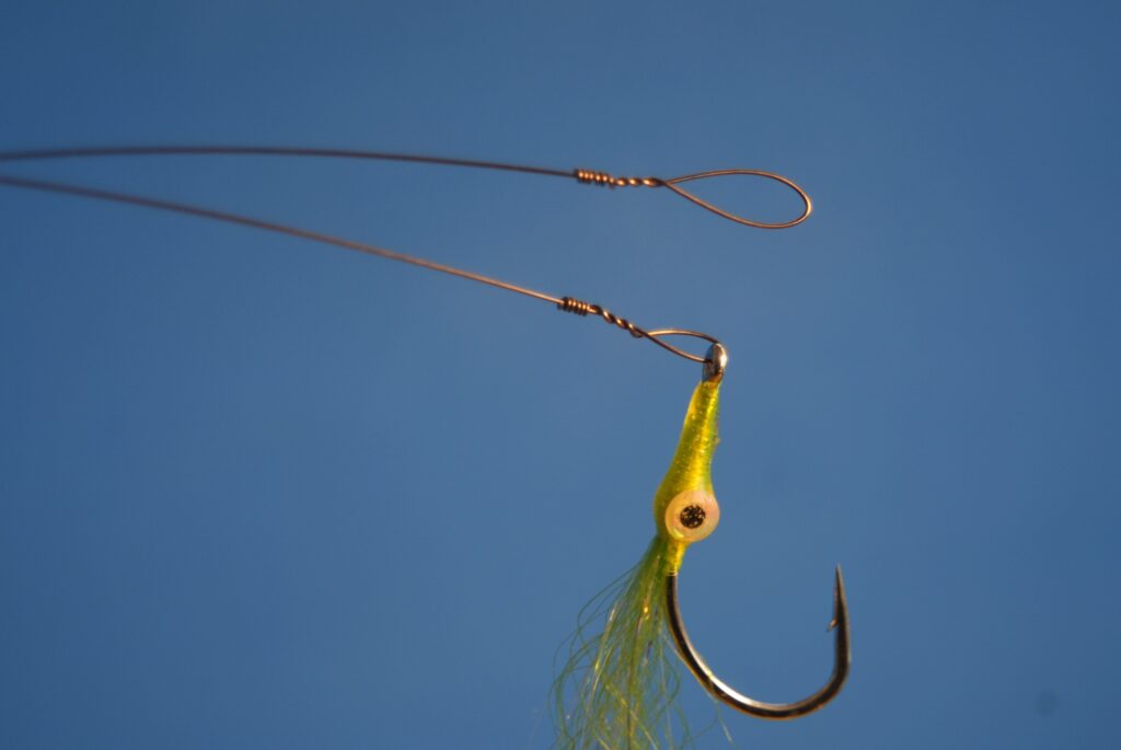 Single-strand wire attachments are made with a unique connection called a “haywire twist”. The wire bite guard is attached to the eye of the fly at one end and a small loop is formed at the other end, both with a haywire. The bite tippet is then attached to the end of the leader (either mono or fluoro) with an improved clinch knot, just as you would attach a fly with no bite guard. The haywire twist will take some practice to form neatly and quickly. Oddly, it’s easier to work with stiffer, heavier #7 (69-pound-test) through #9 (105-pound-test) wire than it is the lighter gauges typically used in mainstream fly fishing, #3 (32-pound-test) through #5 (44-pound-test). It’s simply because the lighter wire is so flexible. To make a proper haywire, the first three twists are carefully made to ensure the strands cross over each other to create friction that prevents the connection from unraveling under tension (the amount of “pull” anglers generate with fly tackle is rather low, mitigating this issue to a large extent). The haywire is completed with three or four neat, side-by-side “barrel wraps” and the tag end is removed by repeatedly bending it back and forth until the hard wire fatigues and breaks cleanly from the bite tippet, leaving a very clean, smooth connection. This is the only method for removing the tag, as cutting or snipping leaves a residual sharp burr that can scratch or cut fingers. There are likely many YouTube videos available that demonstrate the haywire twist. Practice is the key to proficiency. Single-strand wire is inexpensive and an ideal choice for fly fishing bite tippets and it’s well worth learning to work with this valuable material.