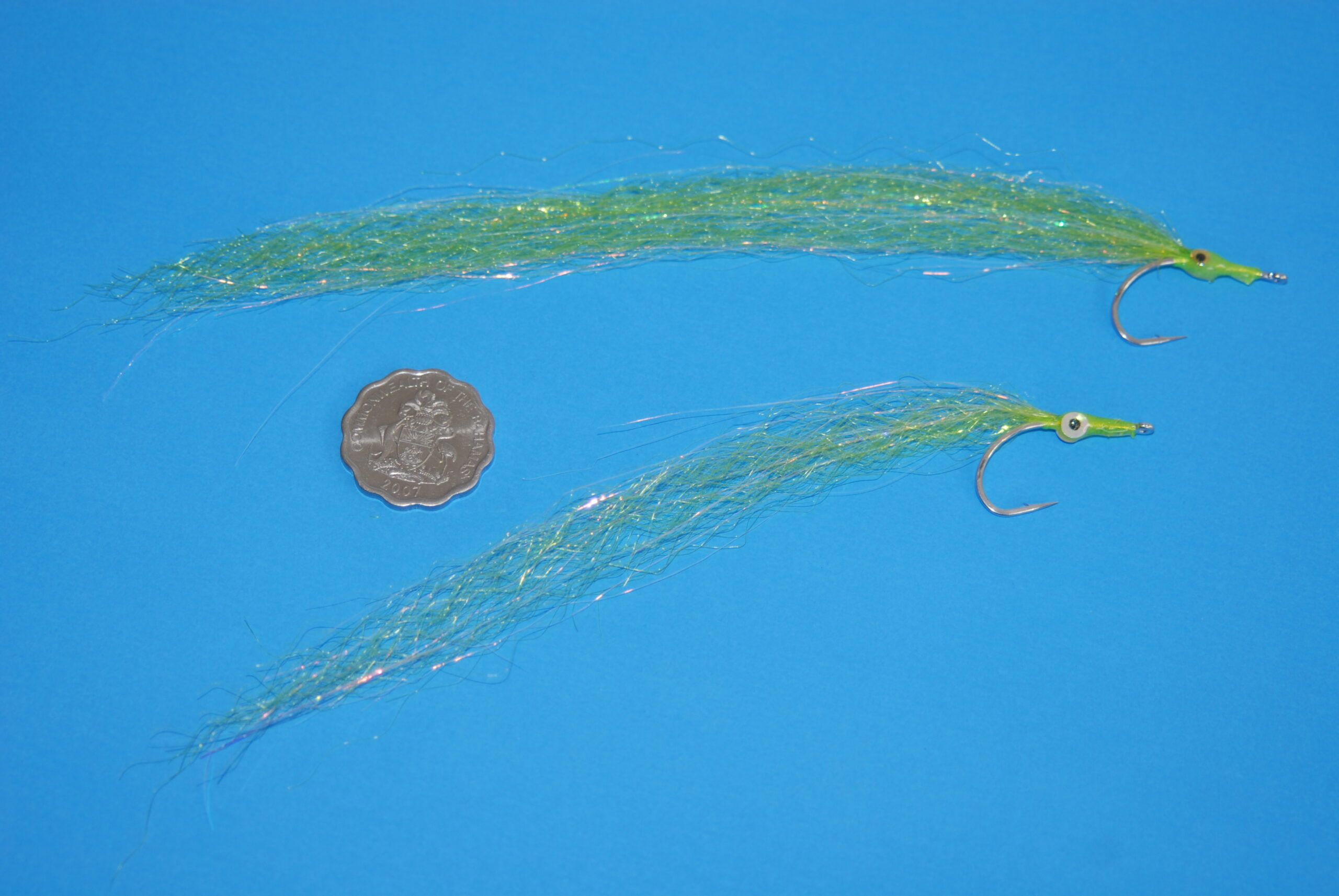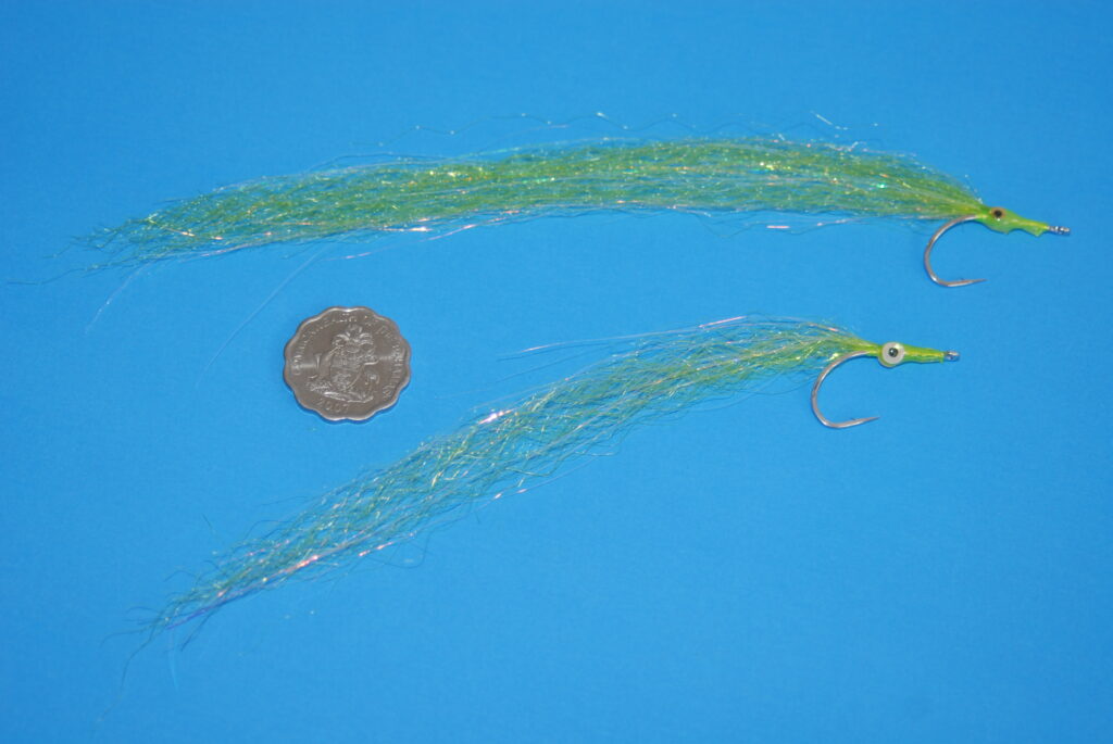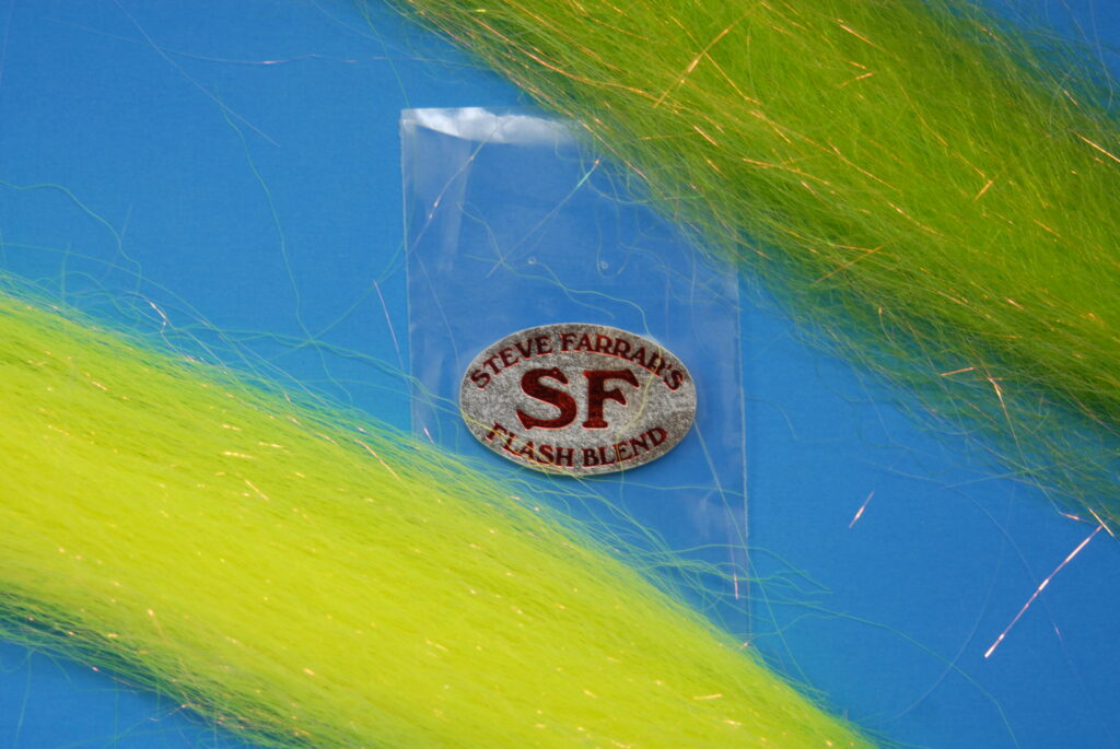 BODY / TAIL: Steve Farrar’s SF Flash Blend, lime or chartreuse (sparse to very sparse); silver or chartreuse holographic Flashabou (a generous amount – pearl or chartreuse POLARFLASH is an excellent alternative)